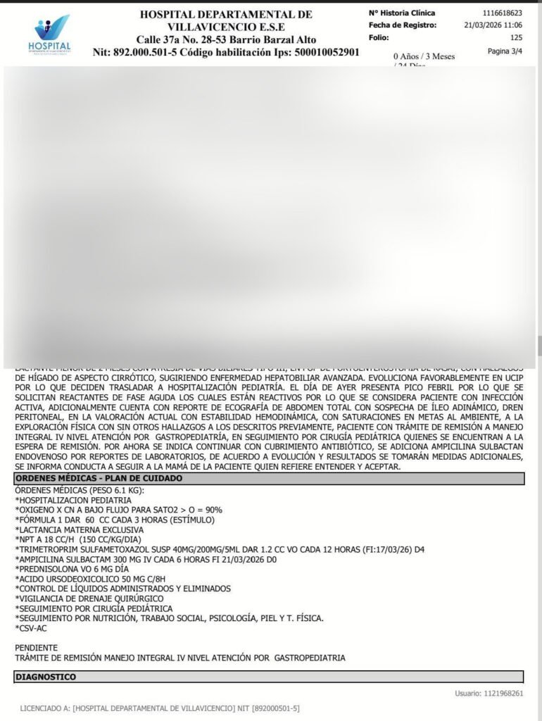 El menor, quien recibe atención médica en el Hospital Departamental de Villavicencio (Meta), fue presentado por el equipo de referencia y contrarreferencia de la EPS a la red hospitalaria contratada y no contratada,  en aras de gestionar su remisión para continuar su manejo clínico en mayor nivel de complejidad en salud, siendo aceptado  por la Fundación Cardioinfantil, bajo la modalidad de un pago anticipado  de 360 millones de pesos, asegurando así sus valoraciones y estudios clínicos.
