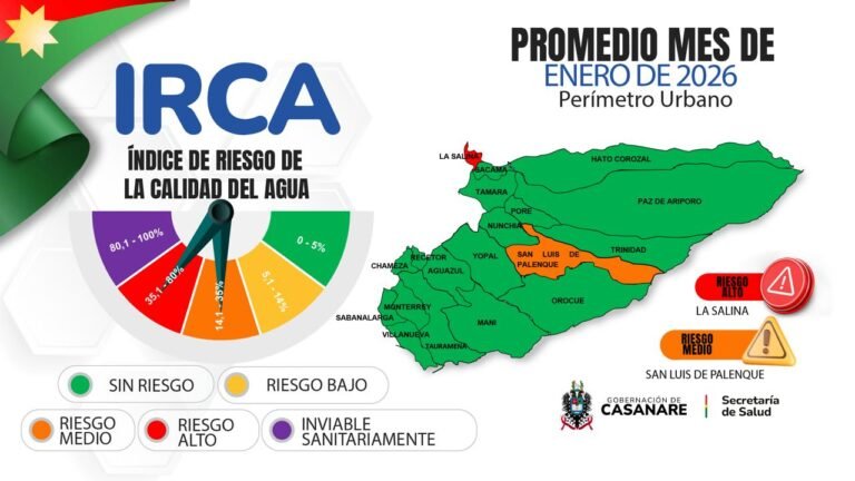 Los resultados del monitoreo de calidad del agua en Casanare en el mes de enero de 2026 divulgados por la Secretaría de Salud, advierten niveles de RIESGO ALTO en La Salina y RIESGO MEDIO en San Luis de Palenque para dicha vigencia.
