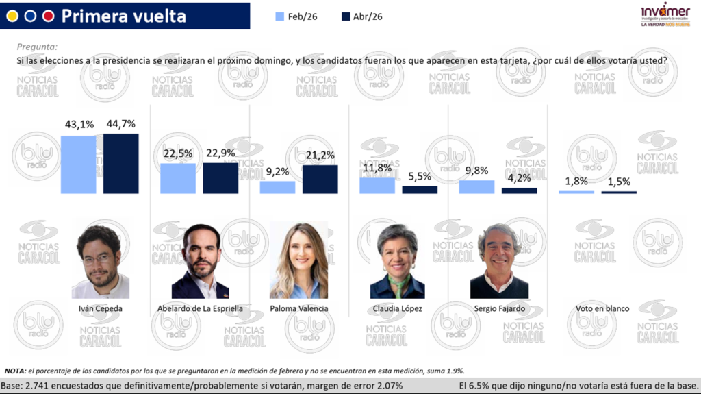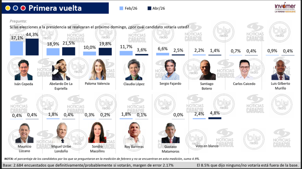 Según la medición de Invamer, publicada por Noticias Caracol y Blu Radio, Cepeda alcanza el 44,3 % de intención de voto en primera vuelta, con un crecimiento de 7,2 puntos frente a la encuesta de febrero, cuando registraba 37,1 %. Esto lo deja a apenas seis puntos de evitar el balotaje y convertirse en presidente en una sola vuelta.