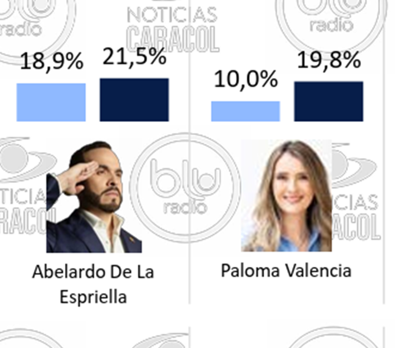 En segundo lugar aparece Abelardo de la Espriella con 21,5 %, mientras que Paloma Valencia marca 19,8 %, configurando un empate técnico entre ambos y una disputa directa por el paso a segunda vuelta. +