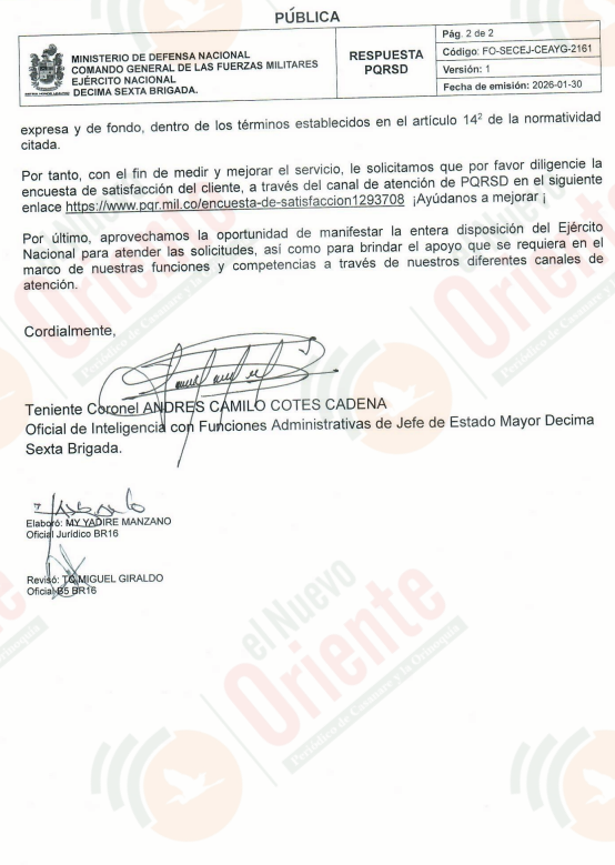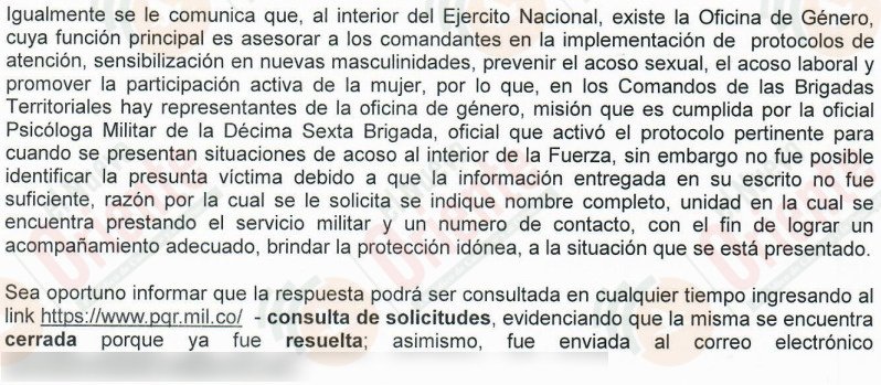 En la respuesta ante la queja, suscrita por el Teniente Coronel Andrés Camilo Cotes Medina, Oficial de Inteligencia con funciones administrativas de Jefe de Estado Mayor de la 16a Brigada, se argumenta que el caso se da por «cerrado» al haber entregado a la quejosa una respuesta «clara, expresa y de fondo» frente a la situación.