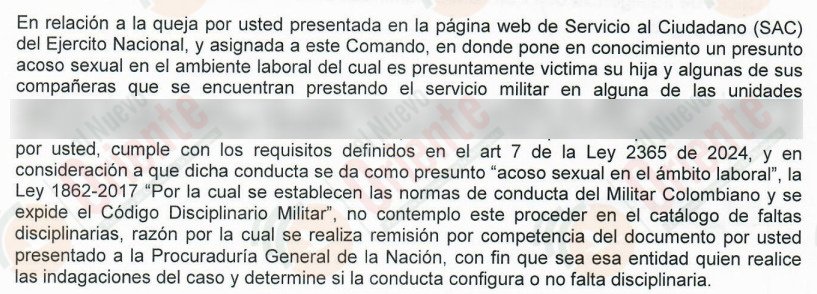 Sin embargo, la familia afirma que «a mi hija me responde con que»como ellos no van hacer nada que lo envían a la Procuraduría donde me ayudan a mirar si es verdad y me doy cuenta que no, que esa queja nunca llegó entonces me doy cuenta que faltan a la verdad en el Ejército».