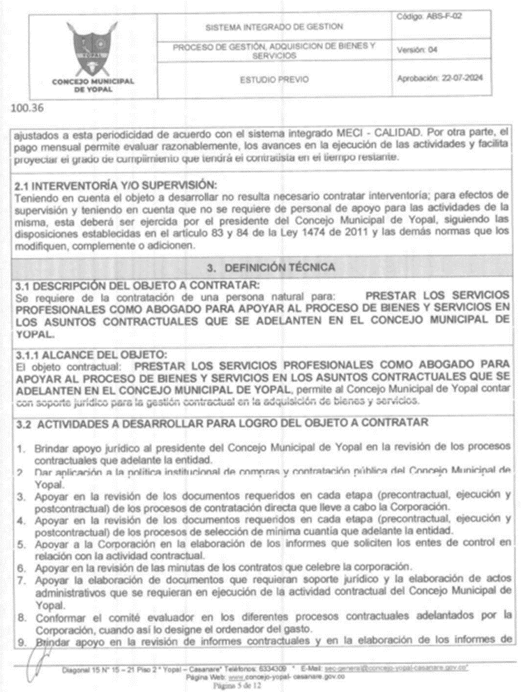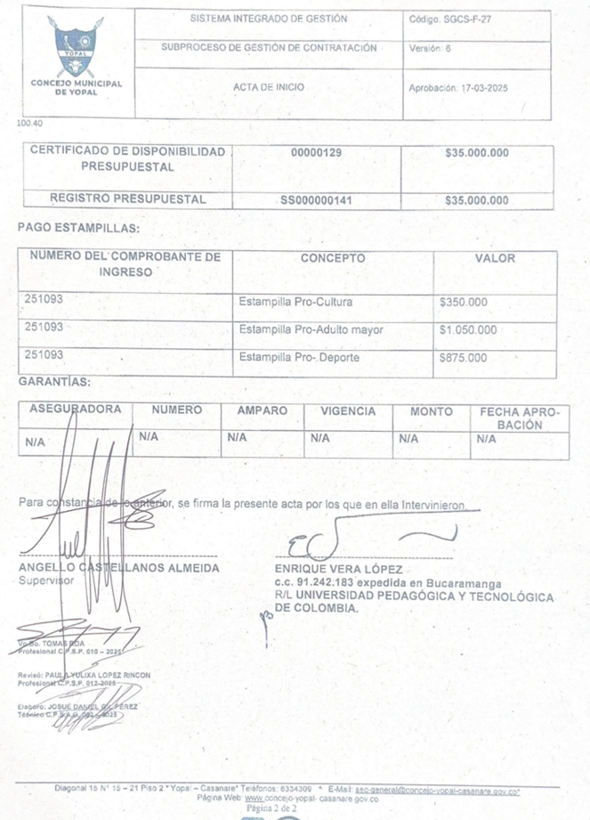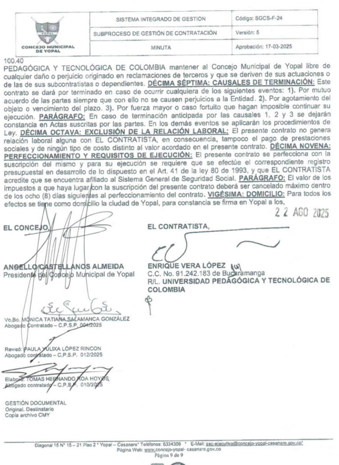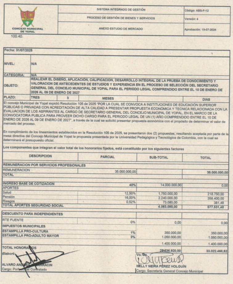 De otra parte Paula Yulixa López, una de las concursantes actualmente se encuentra vinculada al Concejo Municipal de Yopal como abogada de apoyo a los procesos administrativos del Concejo quién dentro de sus actividades tiene la de integrar el comité evaluador de los diferentes procesos contractuales que se adelanten en la entidad. Razón por la cual estampó su firma no solo en el estudio previo sino en la resolución que resuelve celebrar Contrato interadministrativo con la UPTC para realizar dicha convocatoria así mismo firmó la minuta y el acta de inicio.