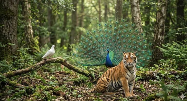 La paloma surcaba los cielos, el tigre recorría los senderos y el pavo real habitaba claros tranquilos.