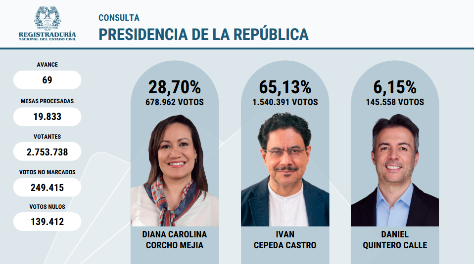 Con aproximadamente 1,500 millones de votos —unos 65,1% de los sufragios contabilizados— Cepeda superó a la exministra de Salud Carolina Corcho, quien obtuvo cerca de 680.000 votos (28,7%). Los conteos fueron reportados por agencias y medios nacionales con escrutinios parciales y definitivos de la Registraduría.