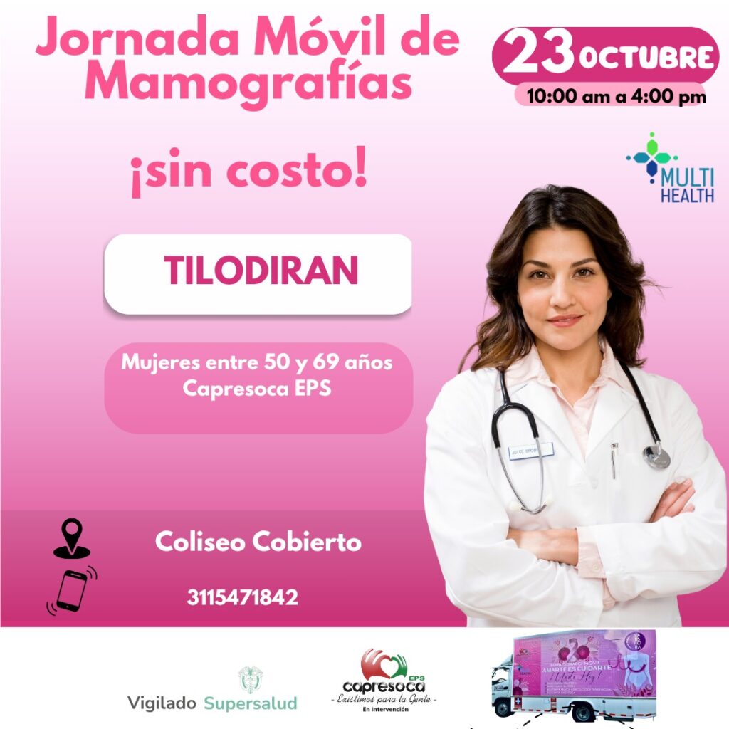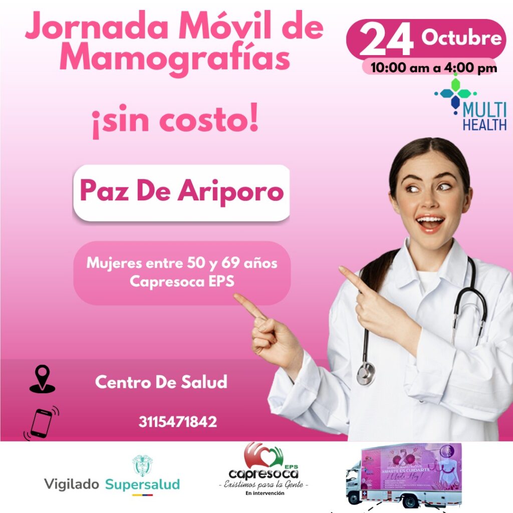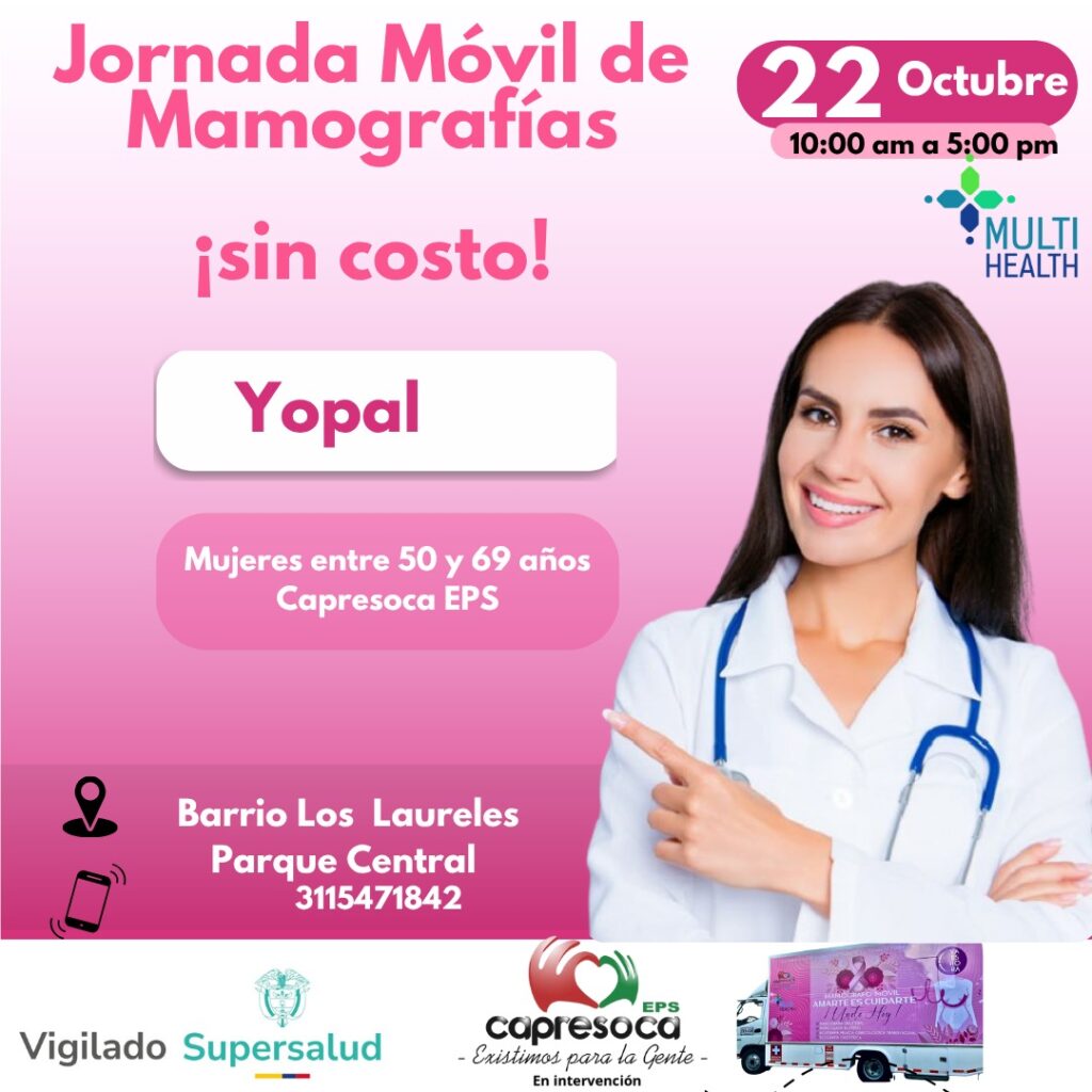 En el mes de la lucha contra el cáncer de mama, Capresoca EPS continúa comprometida con el cuidado de la salud de las mujeres casanareñas. Por eso, invita a todas sus usuarias entre 50 y 69 años a participar en la Jornada Móvil de Mamografías, un servicio sin costo que busca fomentar la detección temprana del cáncer de mama, una de las acciones más efectivas para salvar vidas.