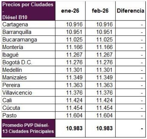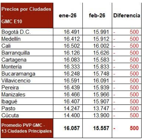 Desde el primero de febrero, la reducción de $500 por galón de gasolina se materializa y se aplica de manera homogénea en las ciudades del país, con precios más favorables para los consumidores, mientras se mantiene estable el precio del diésel, como se observa en las siguientes gráficas: