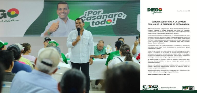 La campaña del candidato a la Cámara de Representantes por la Alianza por Casanare (coalición del Movimiento «En Marcha» y el Partido Verde), Diego Fernando García Alfonso expresó mediante comunicado un rechazo rotundo a las versiones de una presunta inhabilidad en su aspiración electoral.