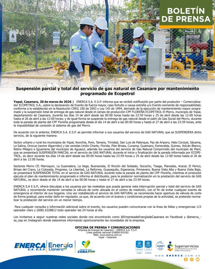 Esto derivado de la ejecución de mantenimiento mayor programado y la suspensión total de entrega de gas natural desde el campo de producción CPF FLOREÑA ECOPETROL El Morro, municipio de Yopal, departamento de Casanare, durante los días 14 de abril desde las 00:00 horas hasta las 23:59 horas y 25 de abril desde las 12:00 horas hasta el 26 de abril a las 12:00 horas; y de igual forma se suspende la entrega de gas natural desde el patín de Gas Social del Morro, durante toda la parada de planta del CPF Floreña programada desde el día 14 de abril a las 00:00 horas y hasta el 27 de abril a las 23:59 horas, ante la imposibilidad de conexión al sistema de gas del Morro.