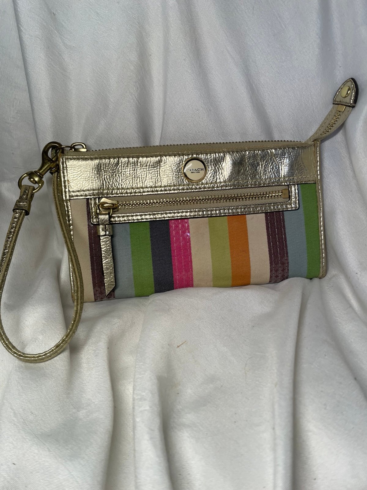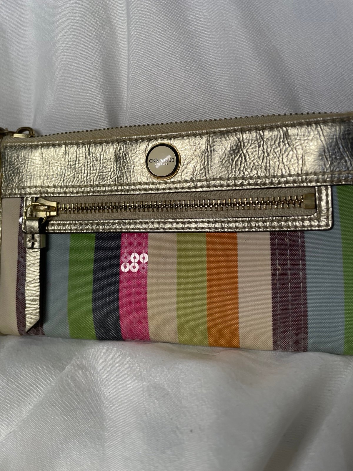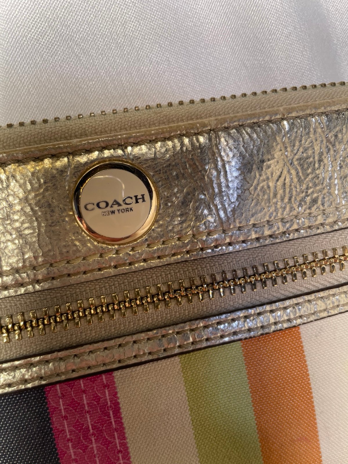 Metallic gold leather trim & wristlet strap with classic legacy stripes and sequins. Tan sateen interior with bill slots and and slip pockets. Front zippered compartment as well. Coach logo medallion on the front. Y2K and rare/hard to find piece!