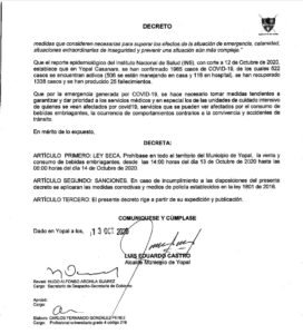 Un decreto prohibiendo la venta de licores y bebidas embriagantes en todo tipo de establecimientos públicos de Yopal, desde las 6 de la tarde de