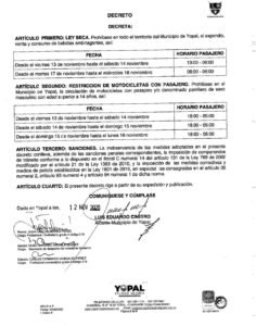 Un decreto que restringe la venta, expendio y consumo de licores y bebidas embriagantes en sitios públicos; así como la circulación de motos CON PARRILLERO